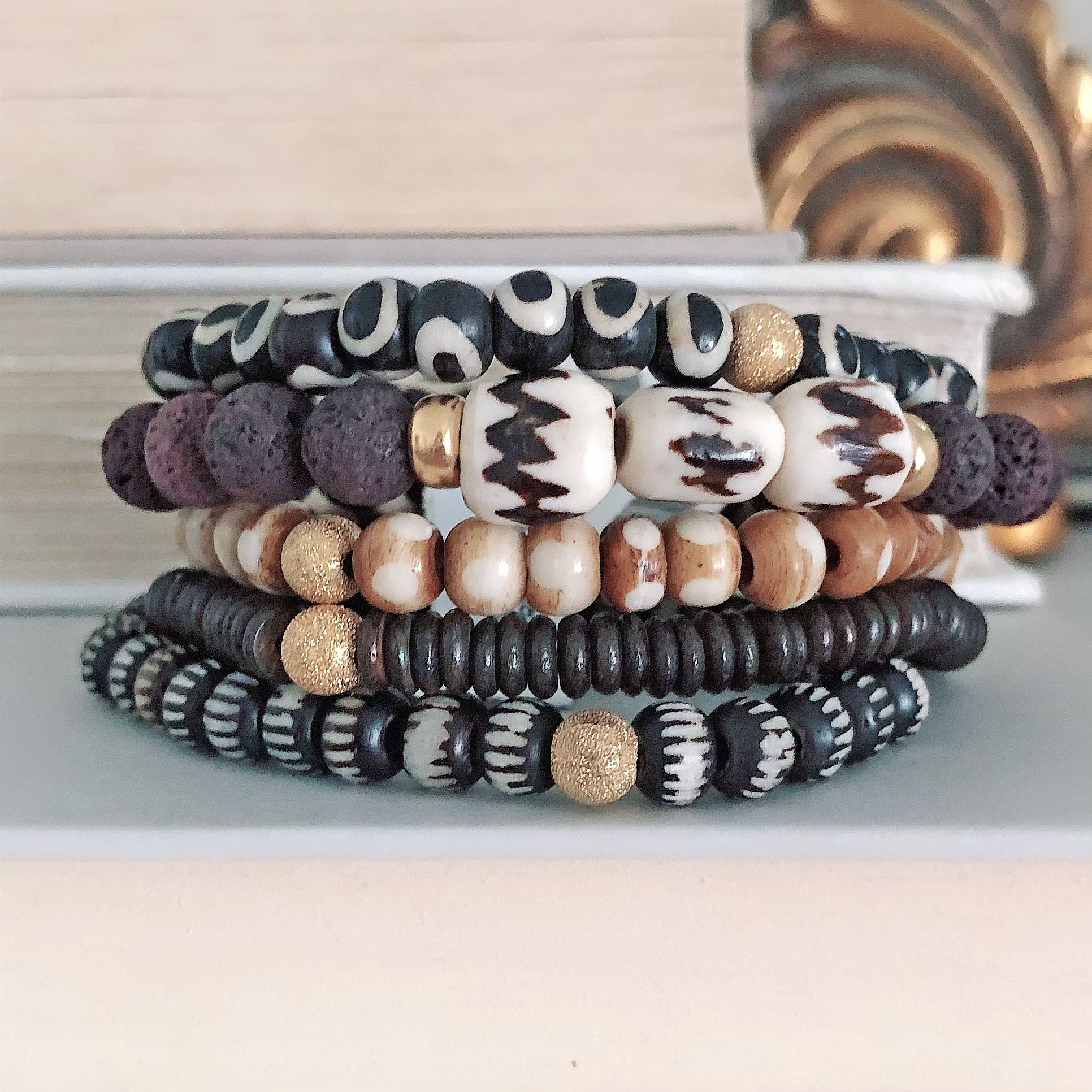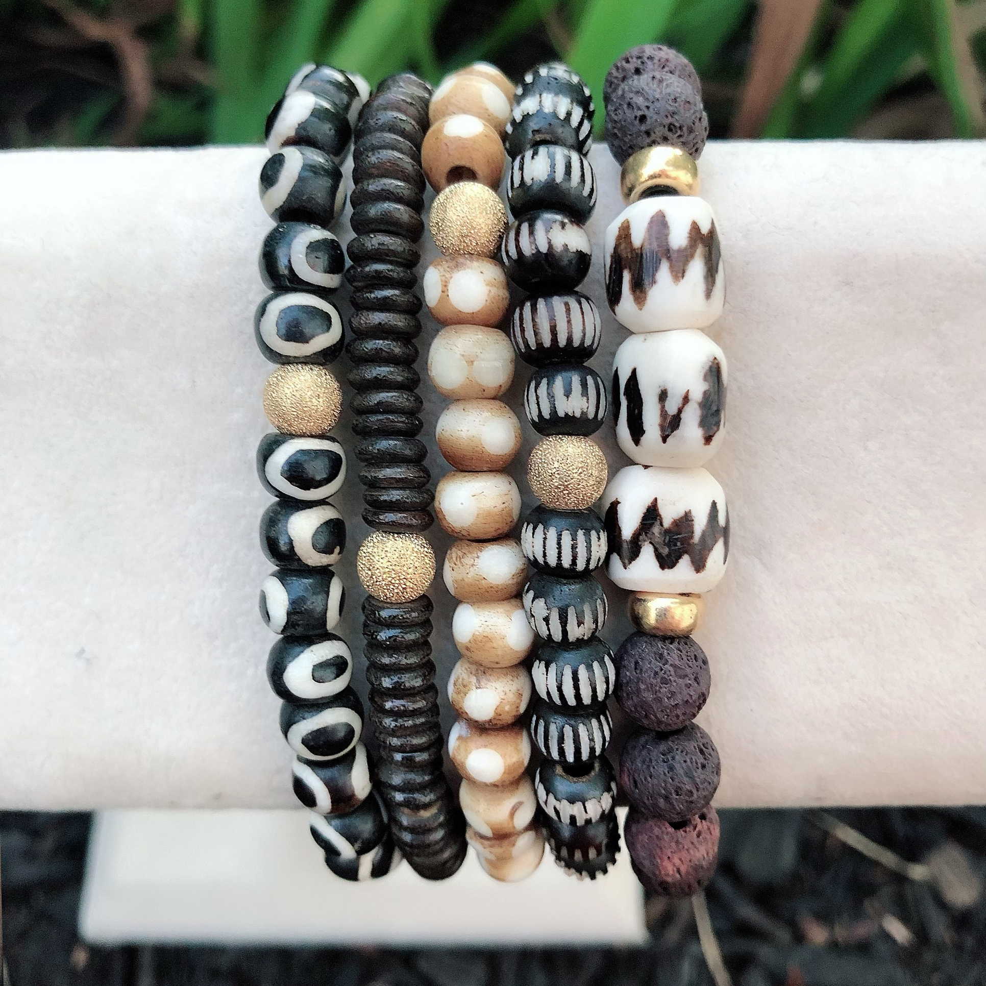 We love the mix of textures and colors that make this group of five bracelets bold while still keeping its neutral palette. This stack is crafted with batik bone beads and lava stone.