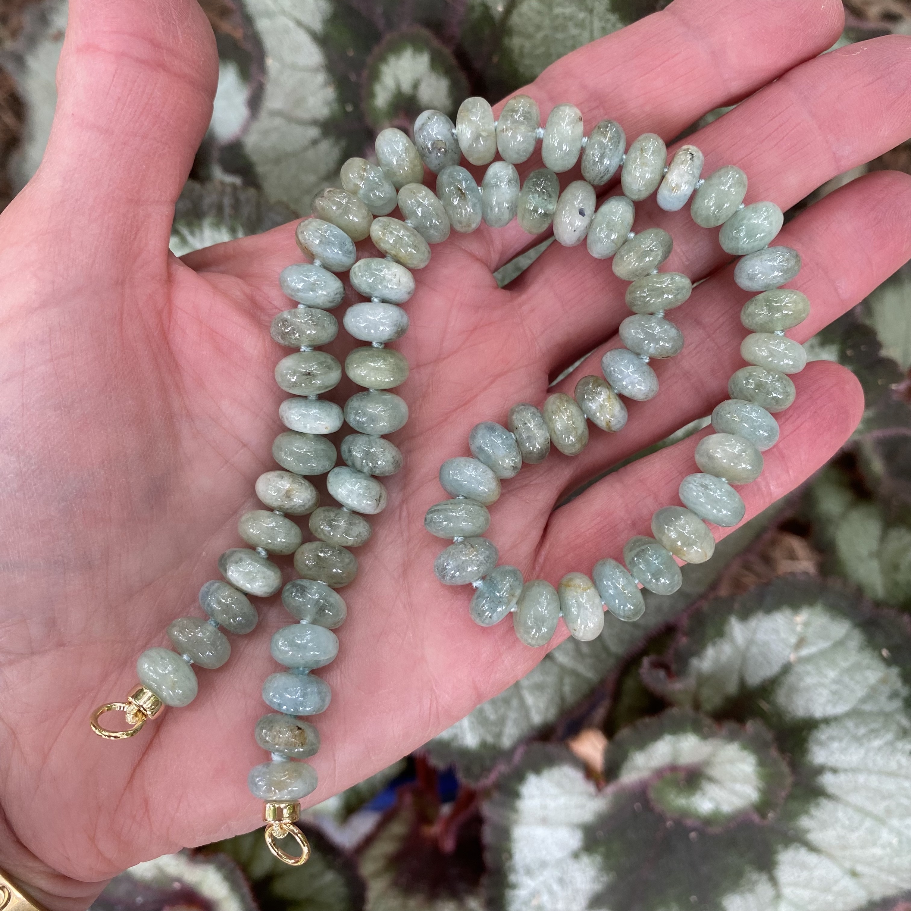 Glossy blue green aquamarine rondelles are hand knotted with gold filled open loops.