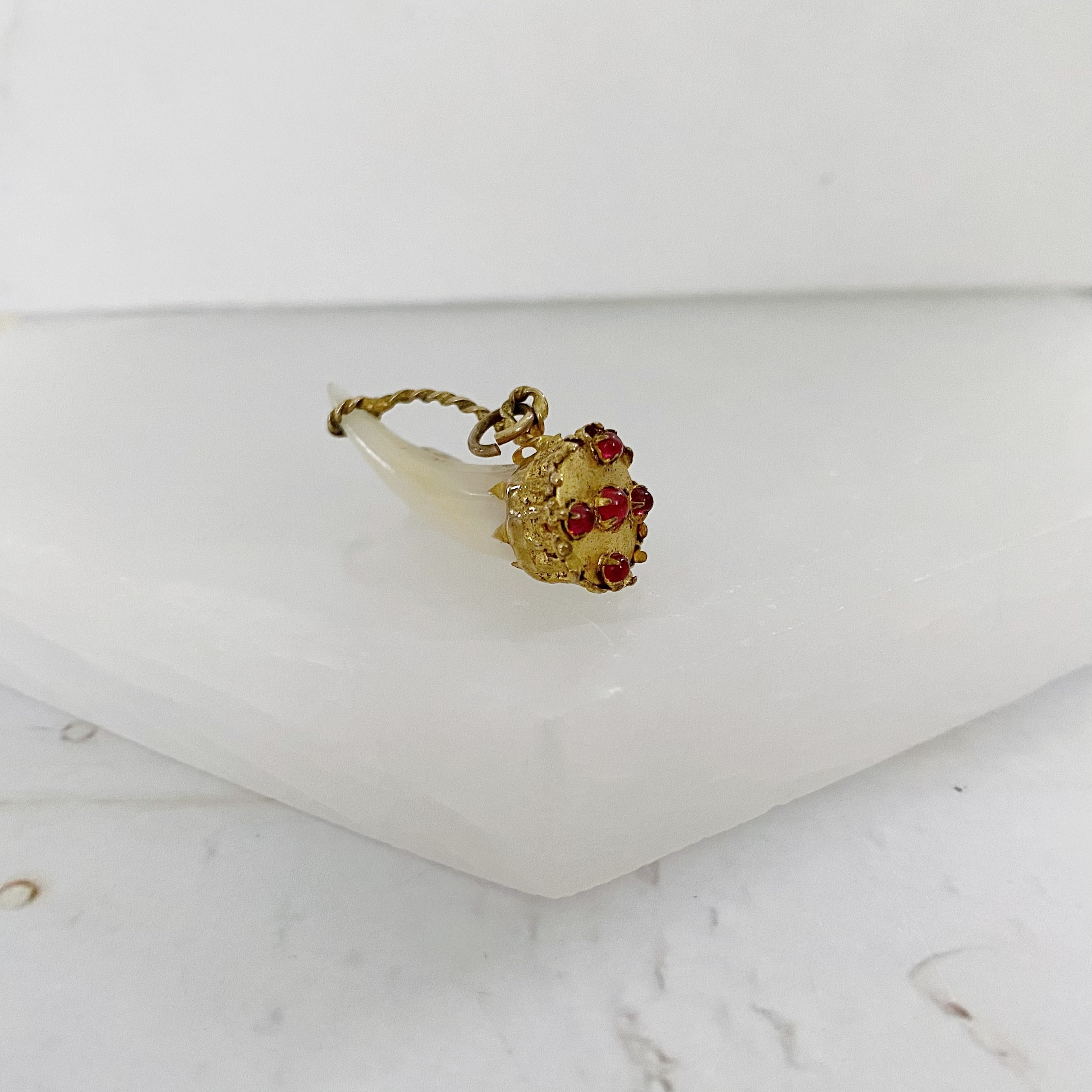 This mother of pearl cornucopia charm has a beautiful luster! We love the intricate wire work and the red stones that stud the top of the charm. A symbol of plenty, wear the cornucopia horn for prosperity and good fortune.