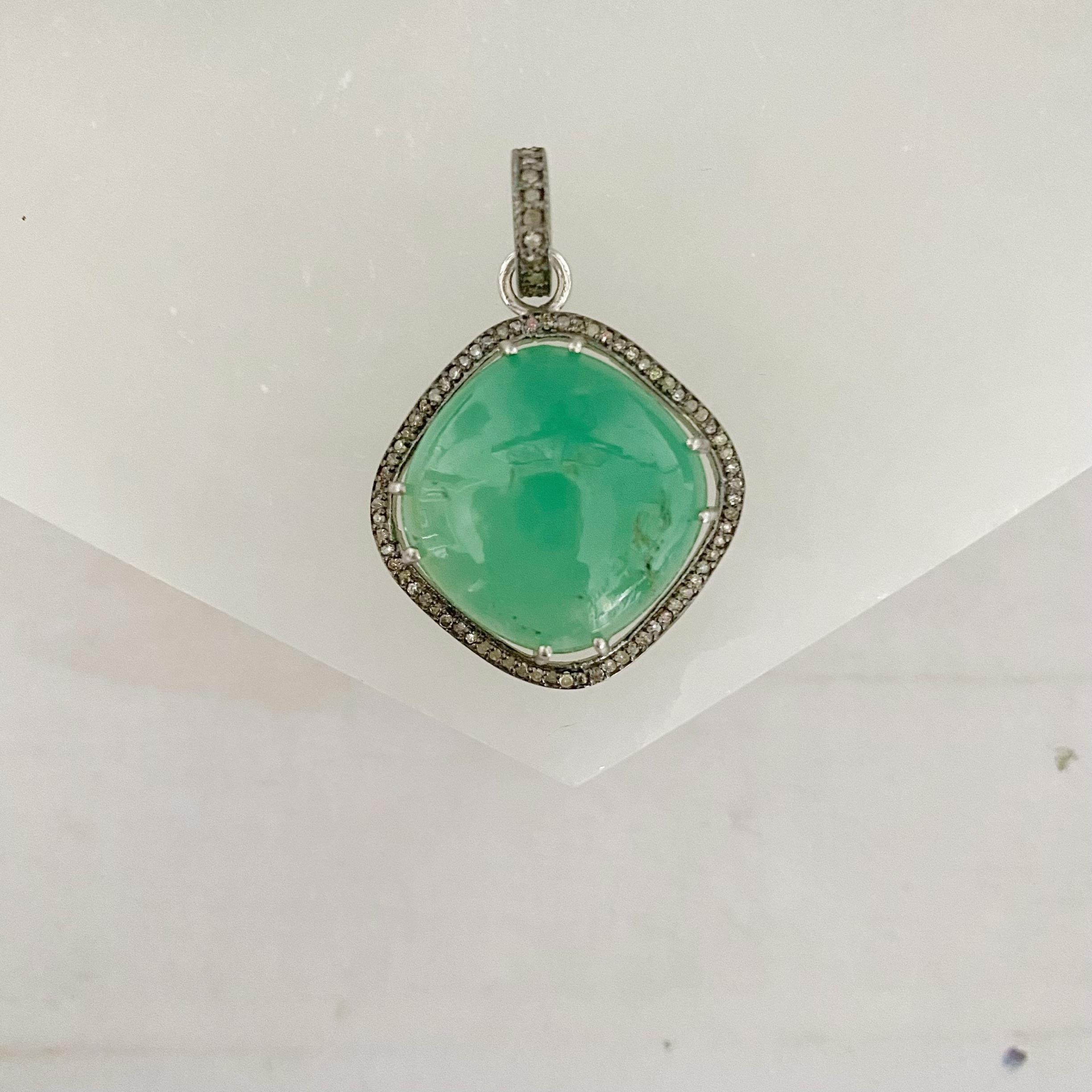 Rich green chalcedony is contrasted against oxidized sterling silver and accented with smoky diamonds in this striking statement pendant.