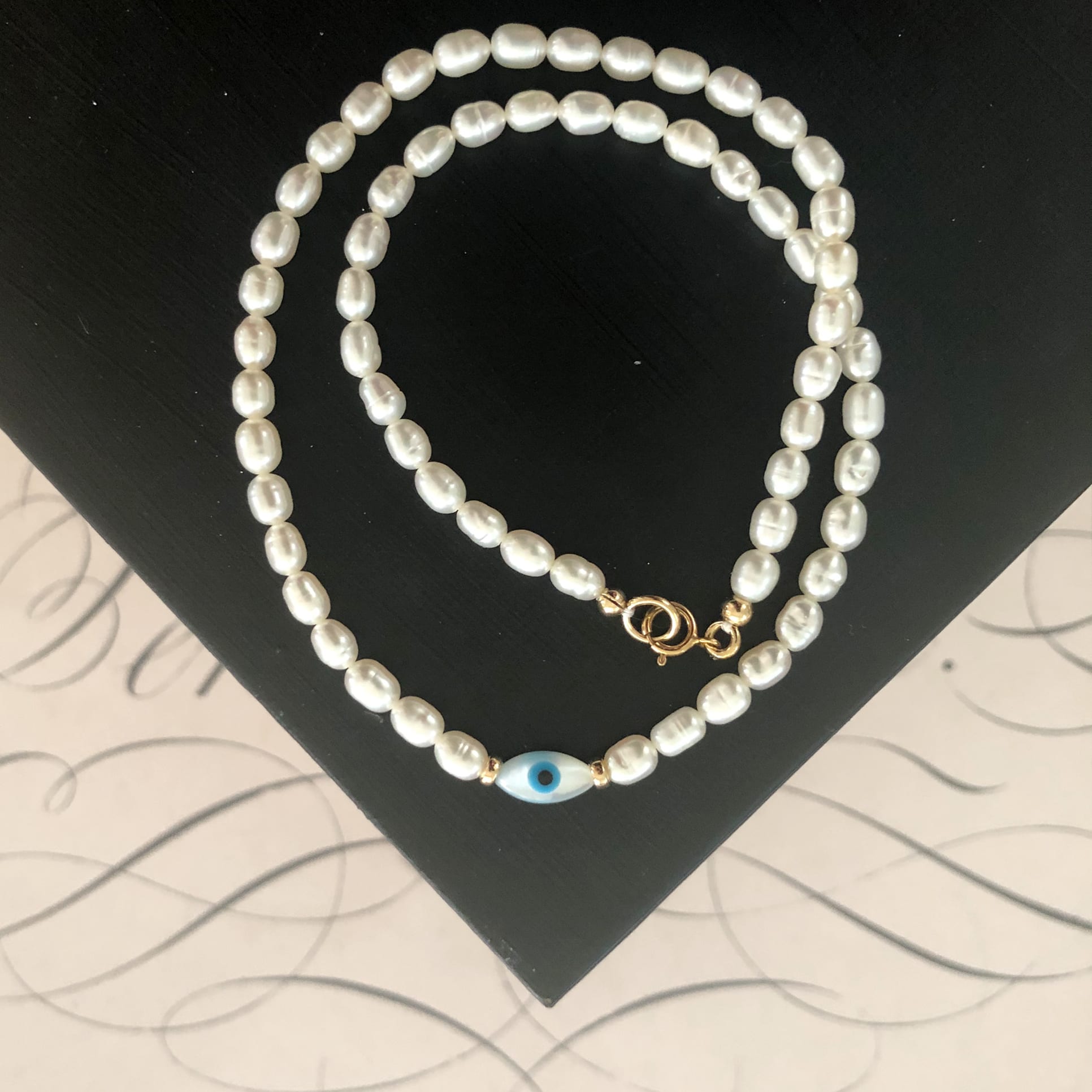 Dainty freshwater pearl beaded necklace centered with a mother of pearl evil eye flanked by small sterling silver beads.