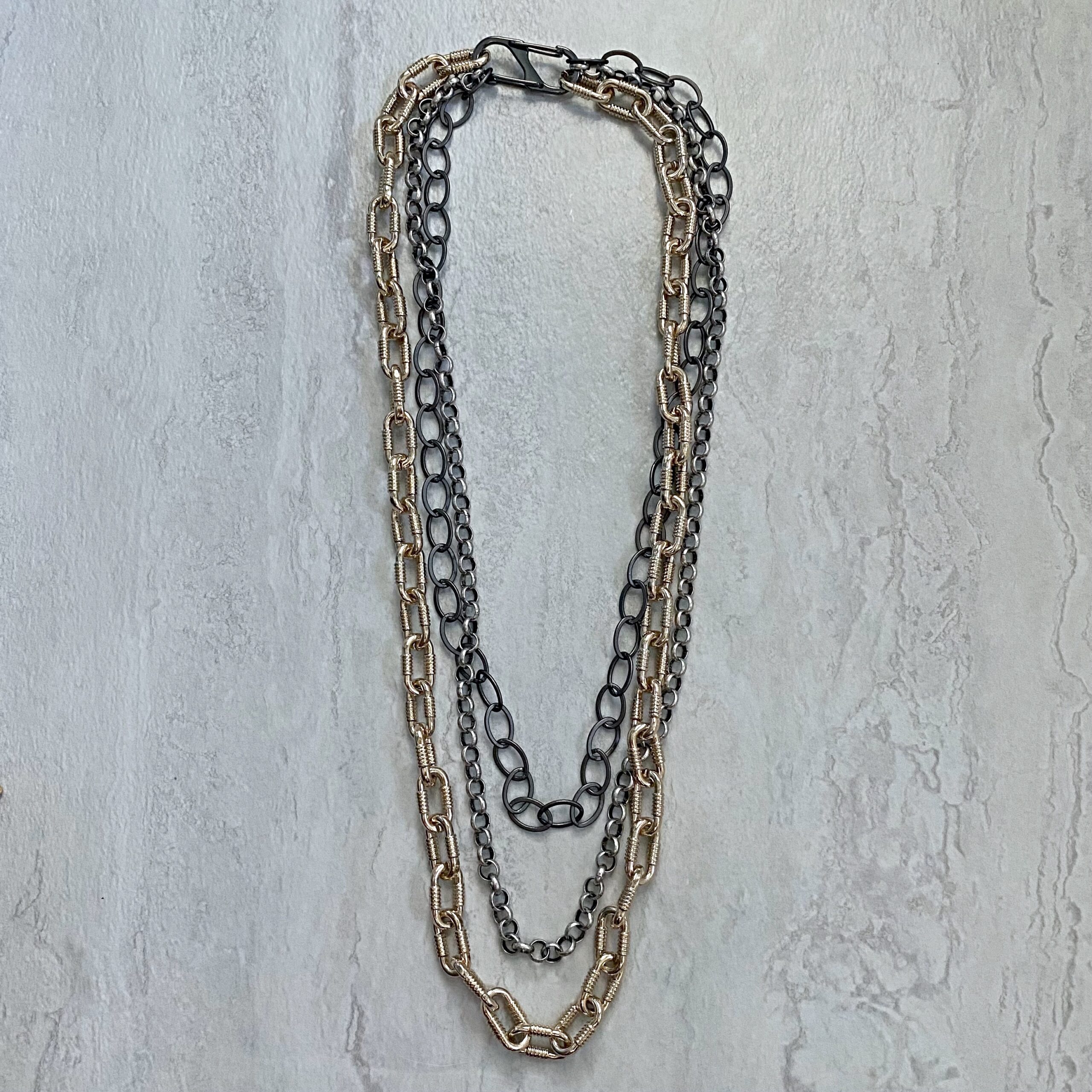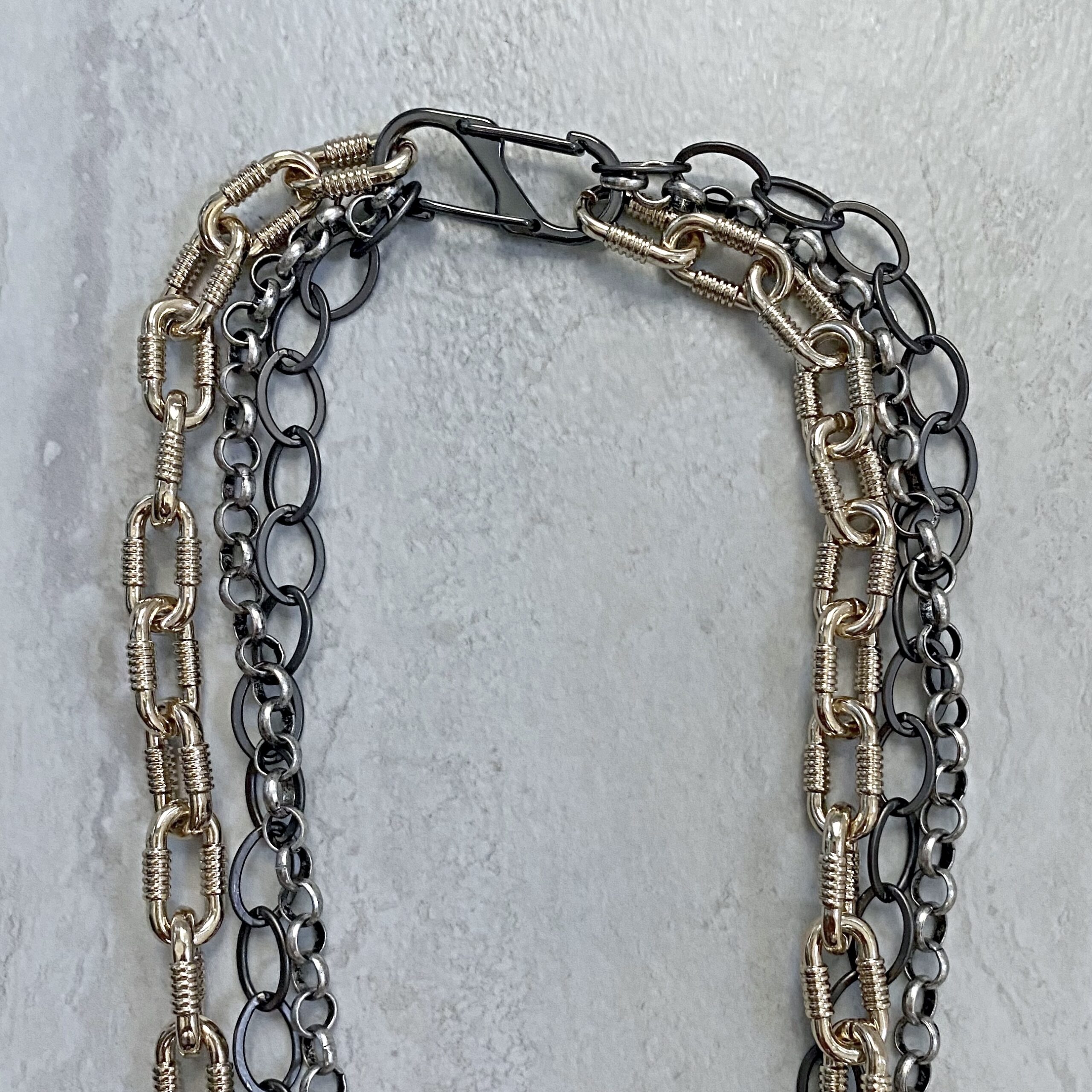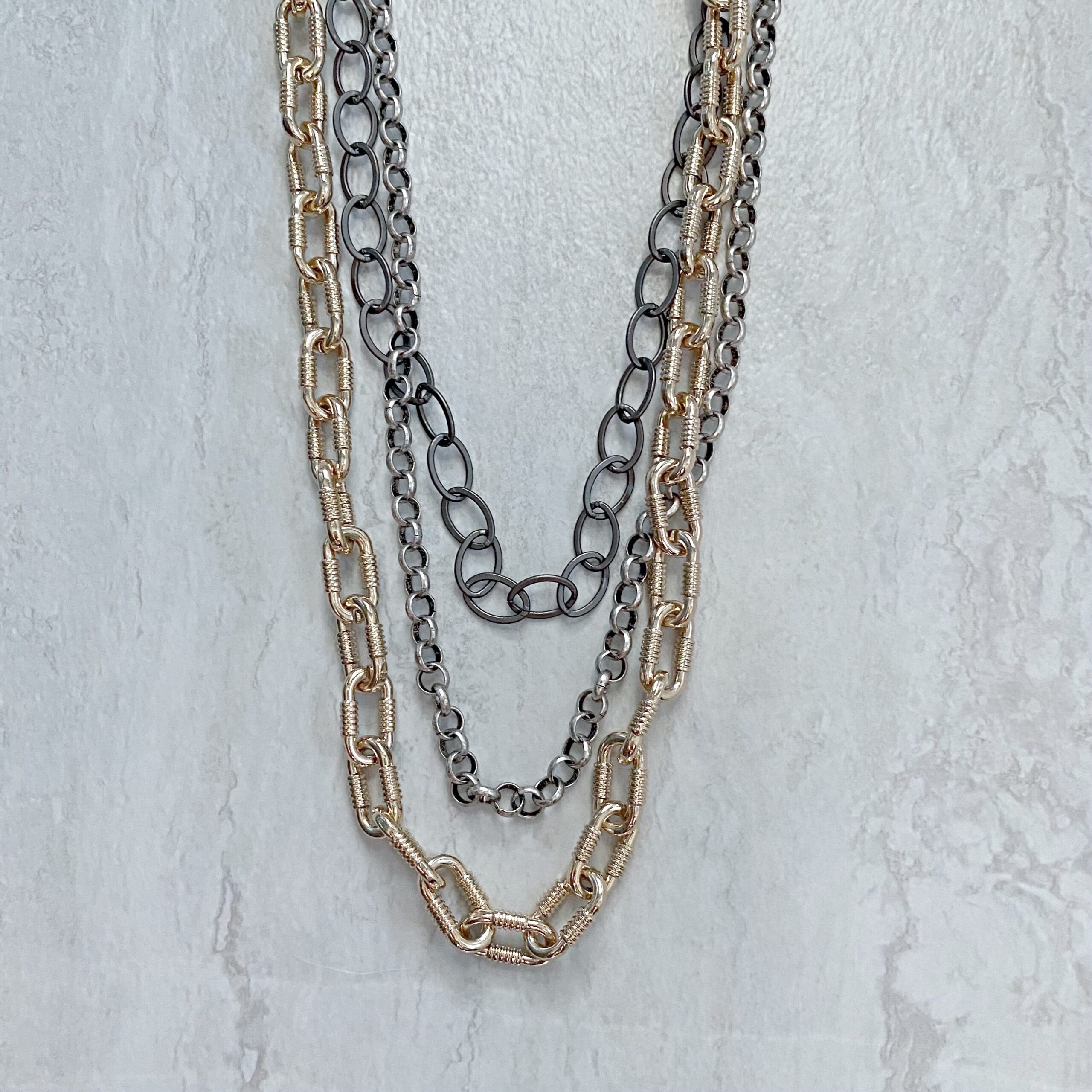 Three chains, gunmetal, gold and silver combine to make a versatile statement necklace.