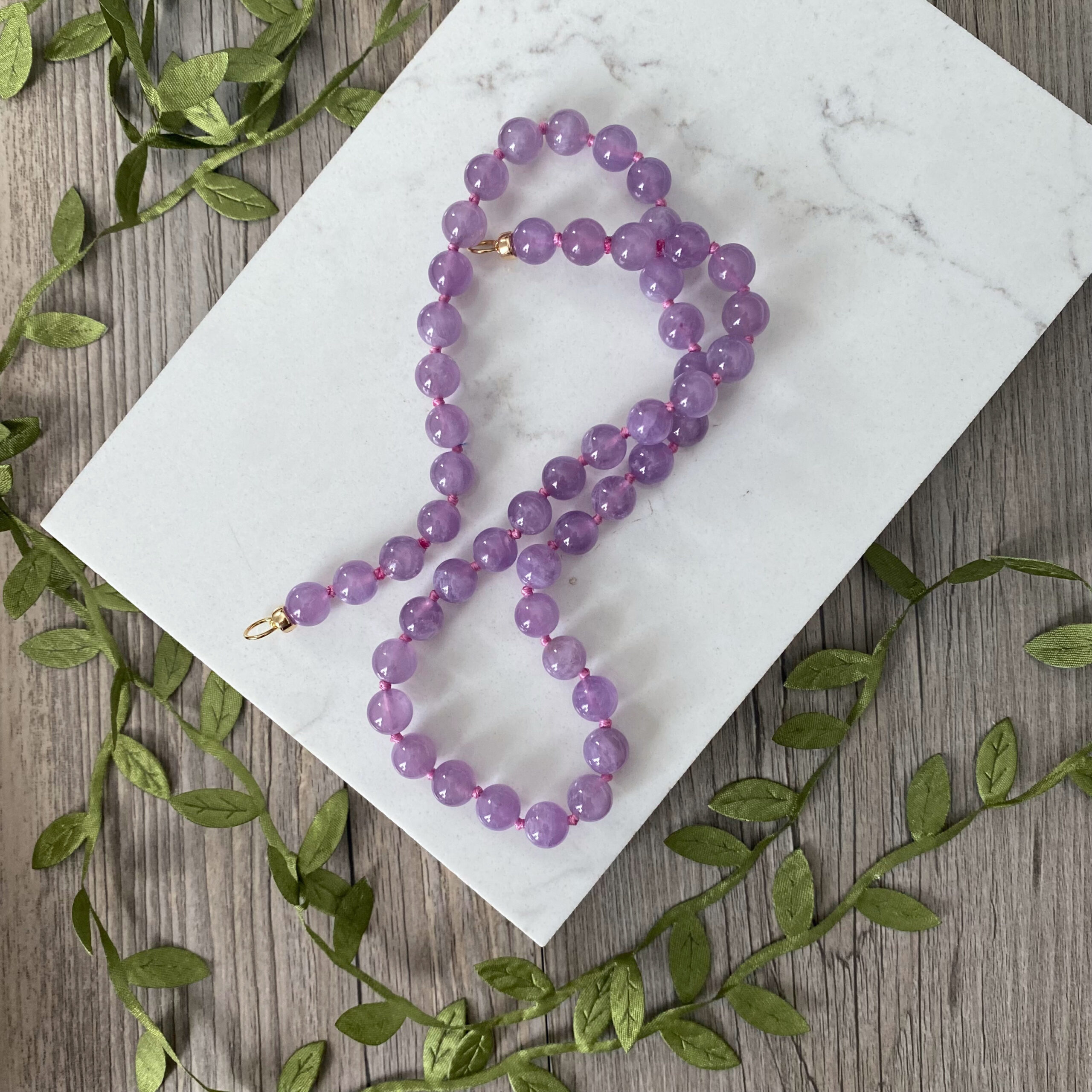 Luscious light purple Rose de France amethyst bubbles are hand knotted on pink silk in this classic open loop necklace.