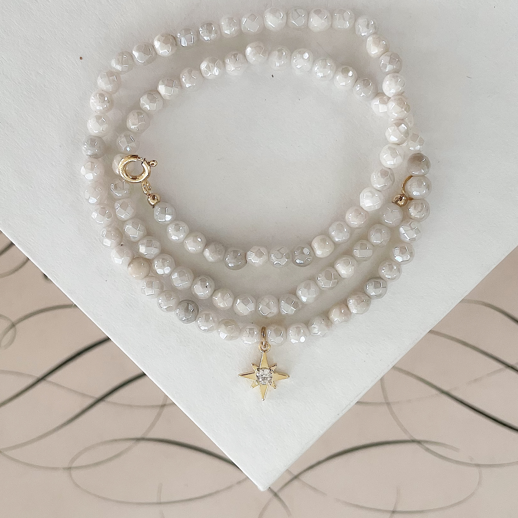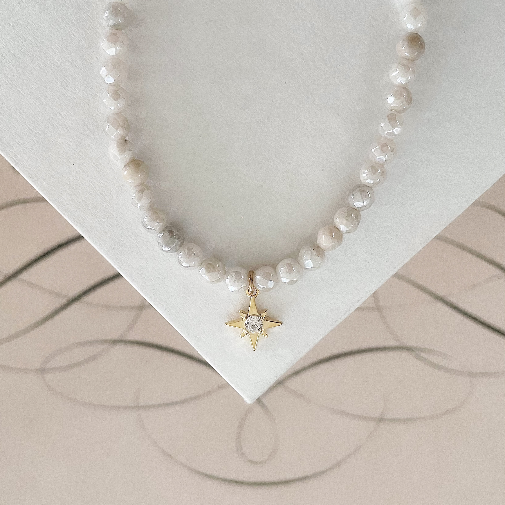 Small faceted mystic phoenix agate beads with a hanging gold filled cubic zirconia star adds softness and sparkle to your neck stack.