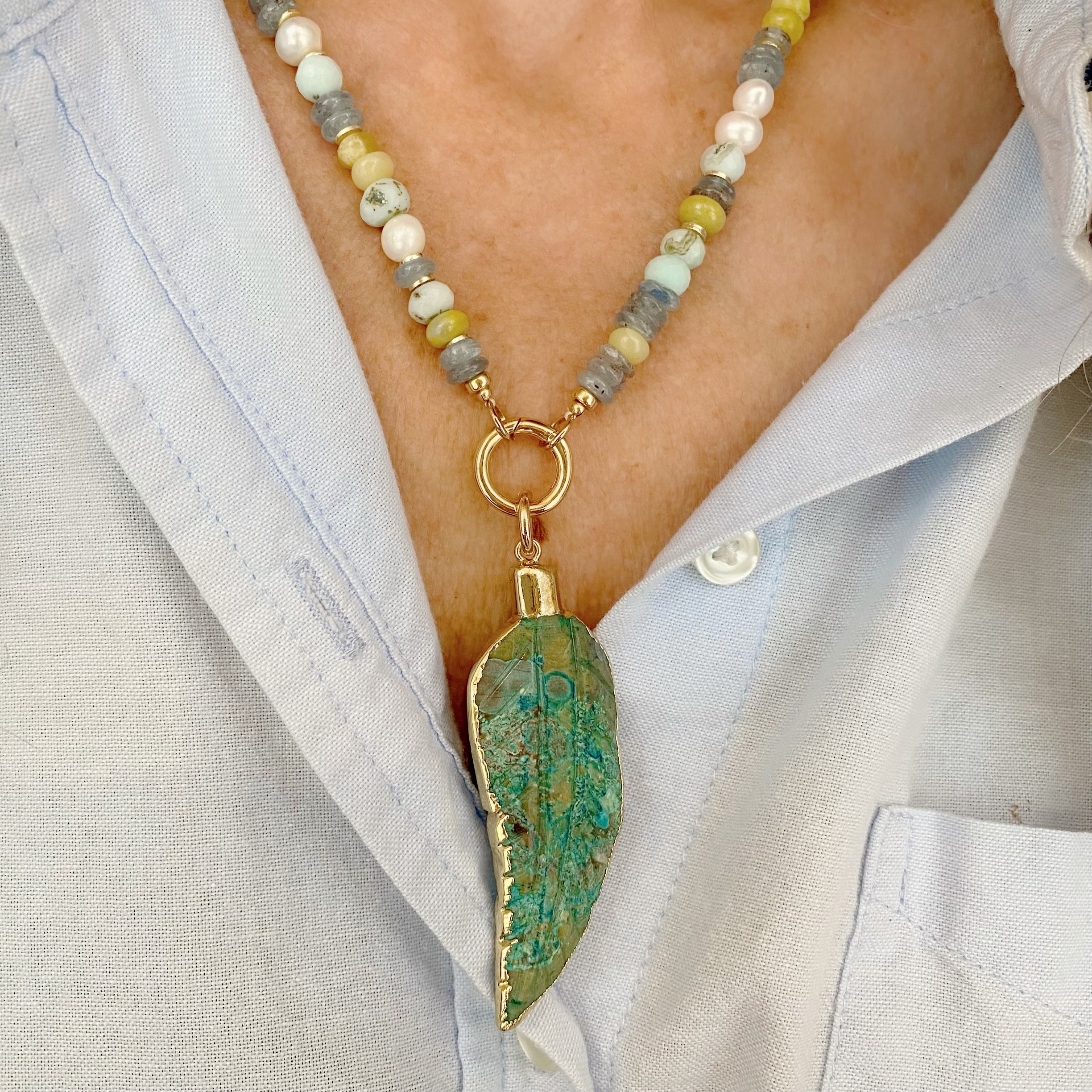 multi gem necklace with charm clasp and feather pendant
