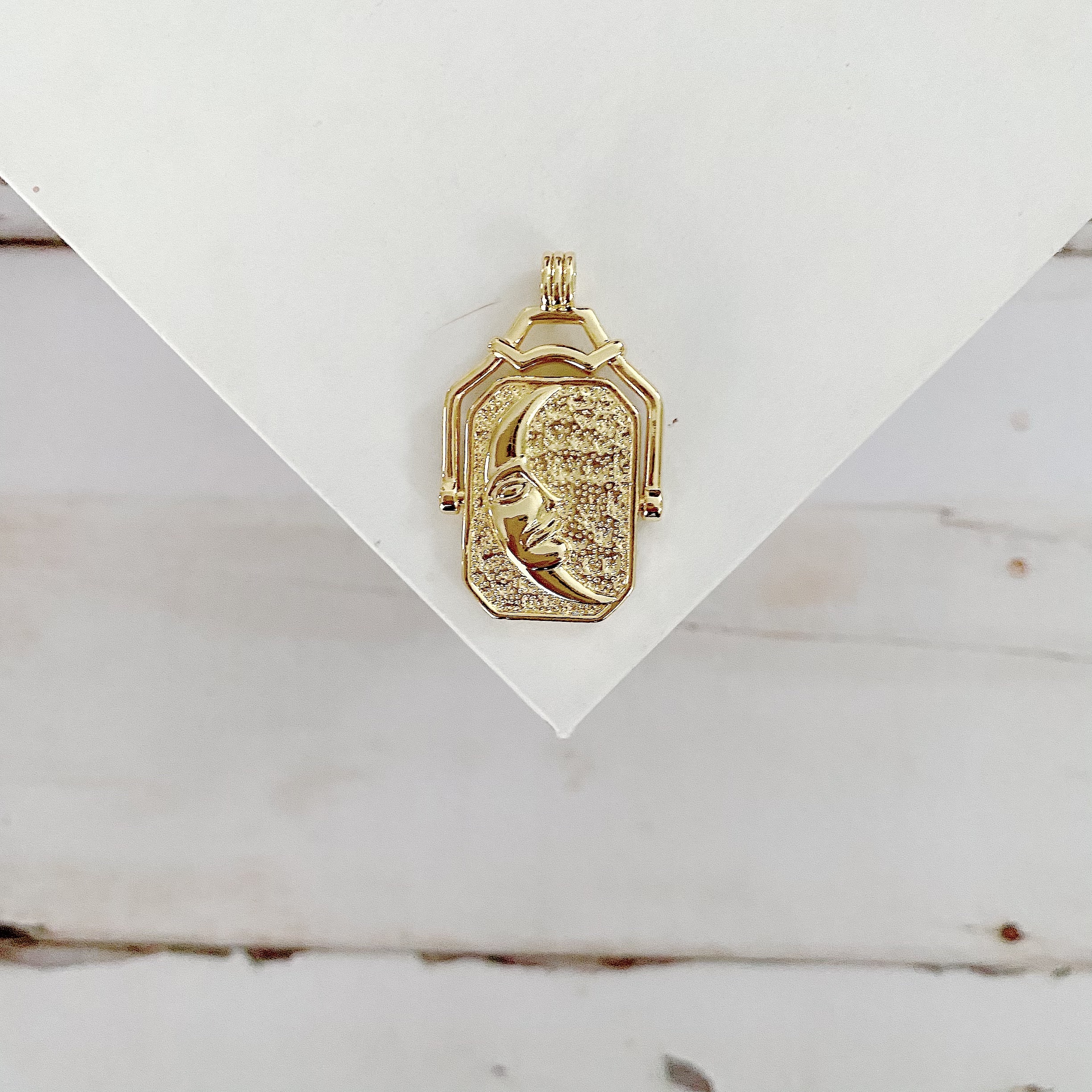 A fun and trendy piece to add texture and shine to your layered necklaces. One side features the sun and the other shows a crescent man in the moon.