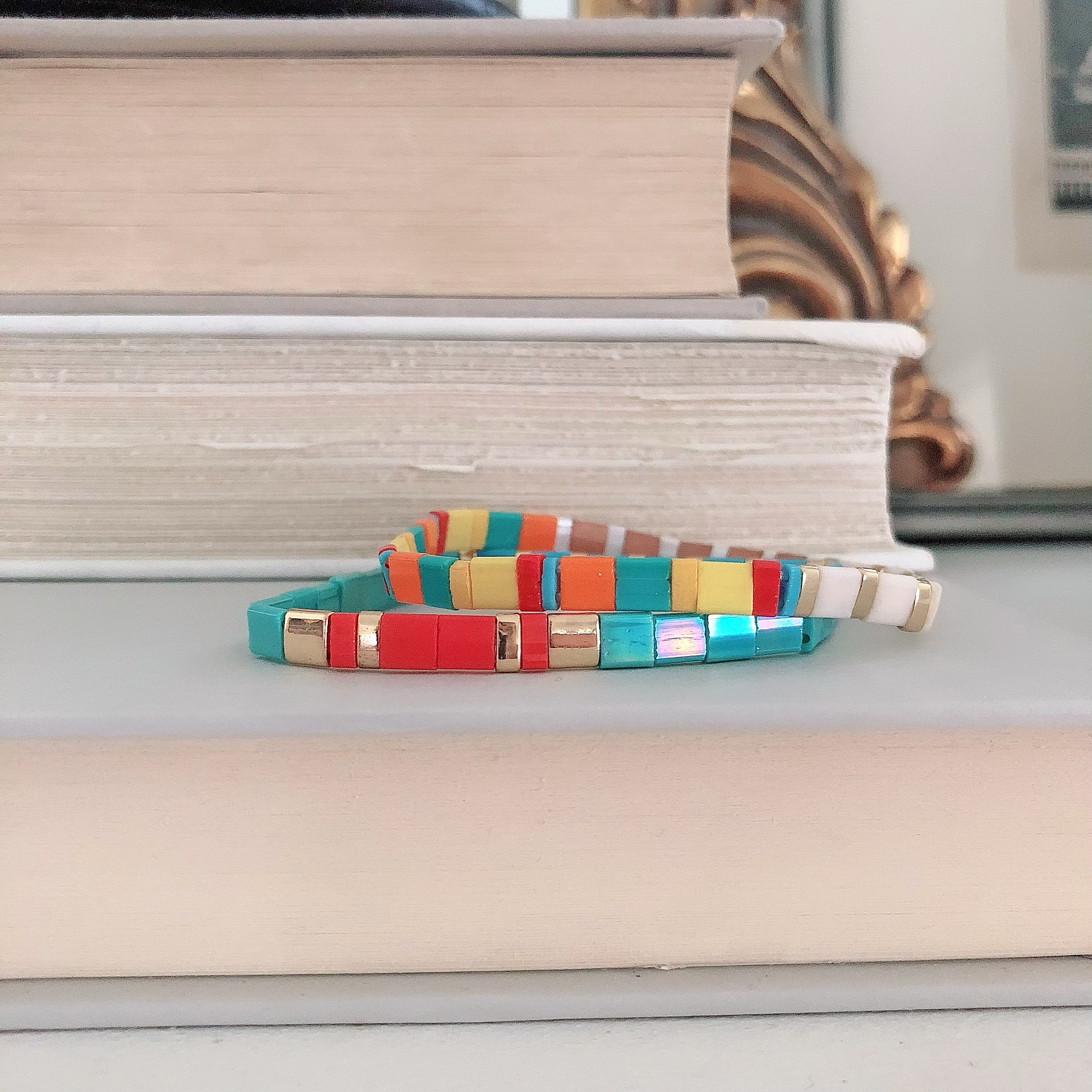 Aqua blues and vibrant reds are paired with soft white counterposed with a rainbow of brights in this duo of petite tile bracelets.