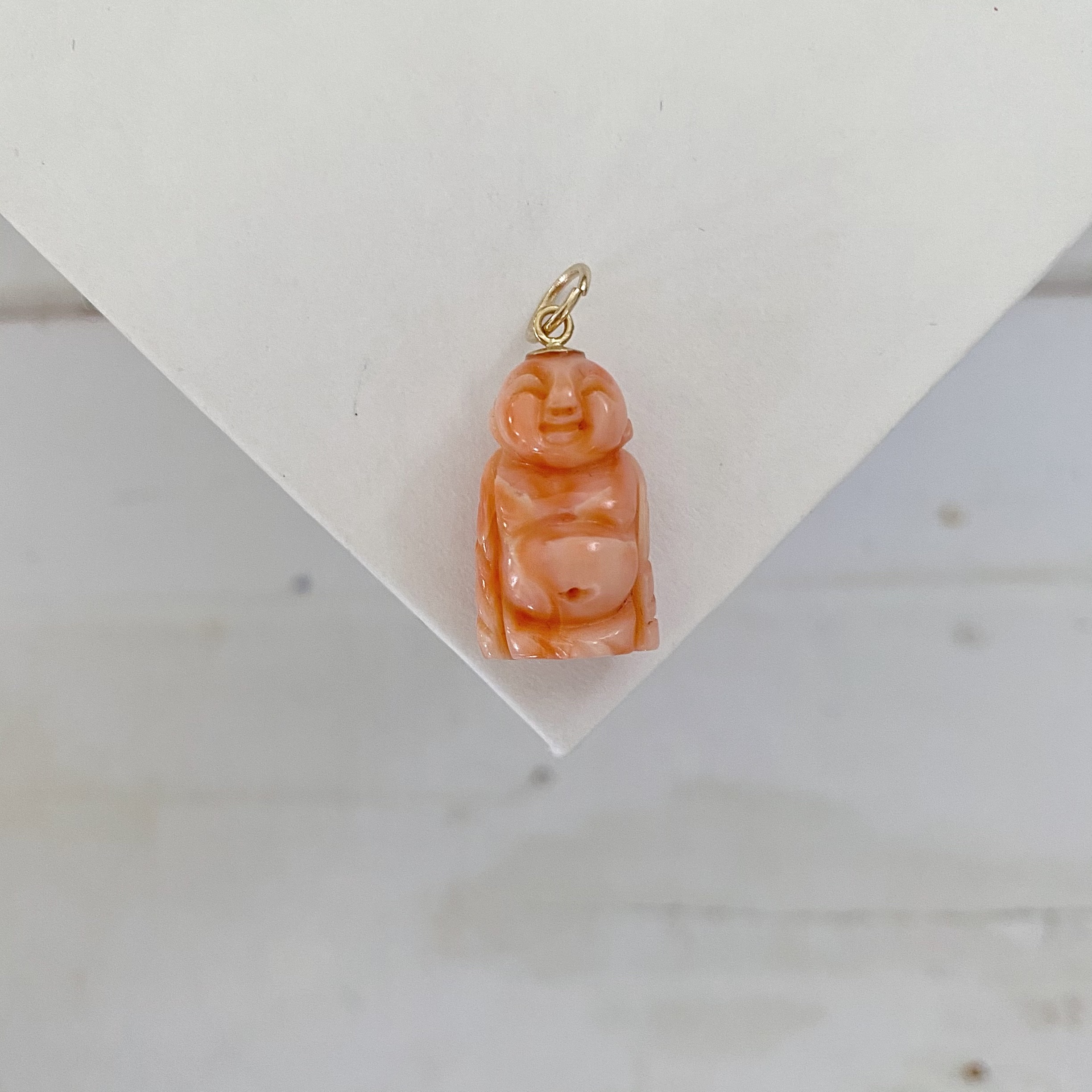 Bring good luck, contentment, and abundance with this vintage carved coral lucky 14k buddha charm. His happy expression makes us smile!