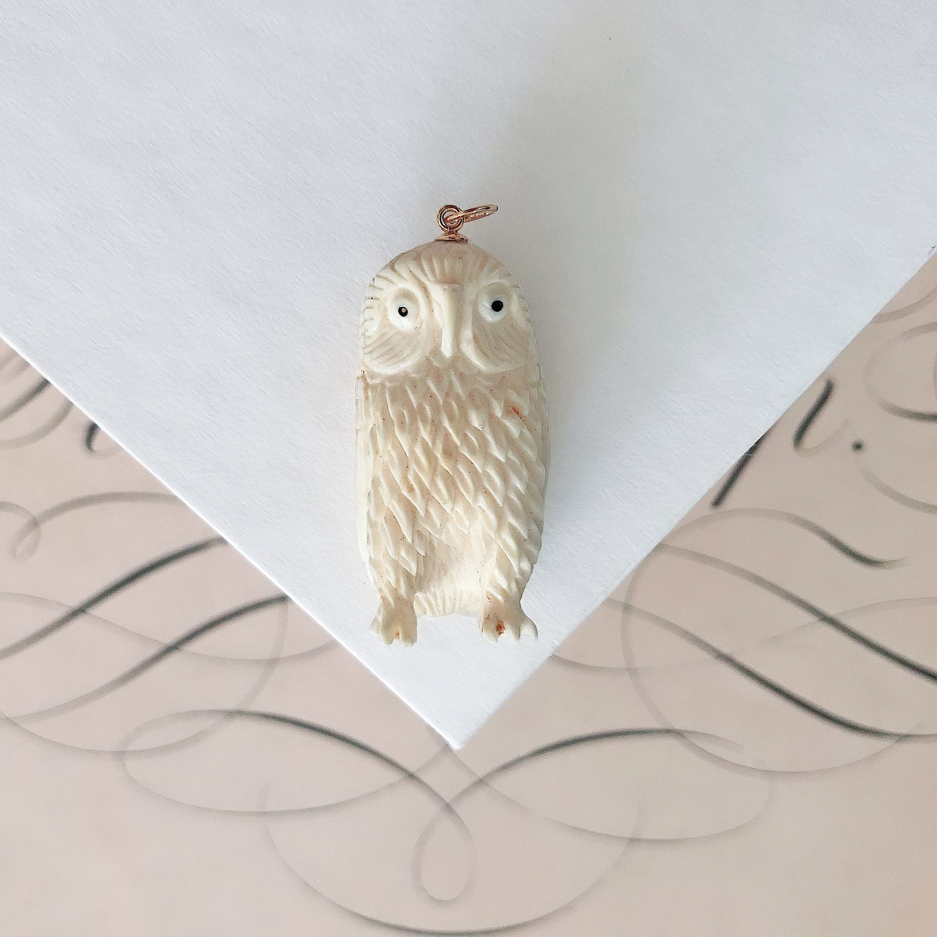 Here is an amazing addition to your nest of charms- a vintage owl pendant topped with 14k findings! We love the carved details on this three dimensional charm.