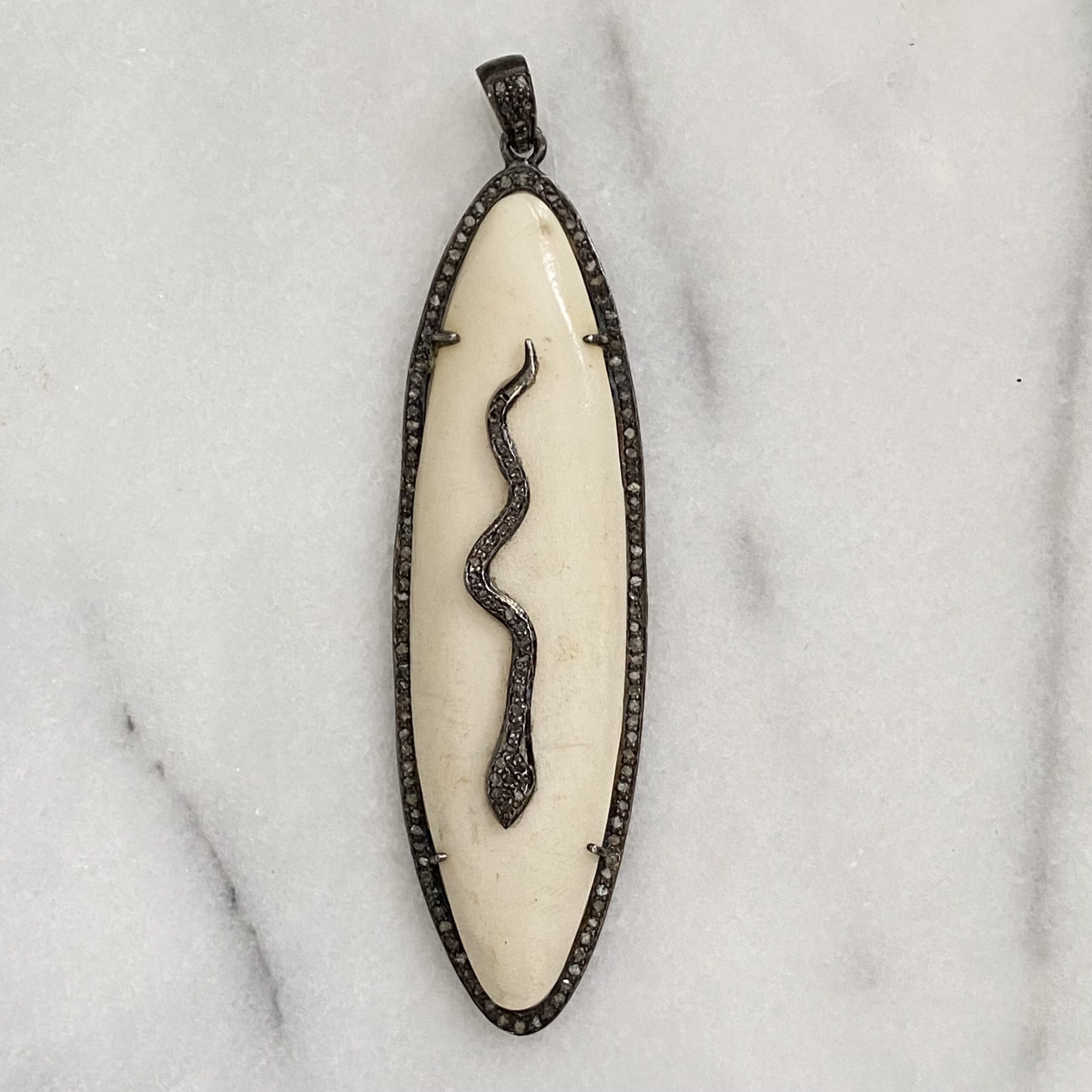 Pave diamond snake and horn oxidized sterling silver statement pendant